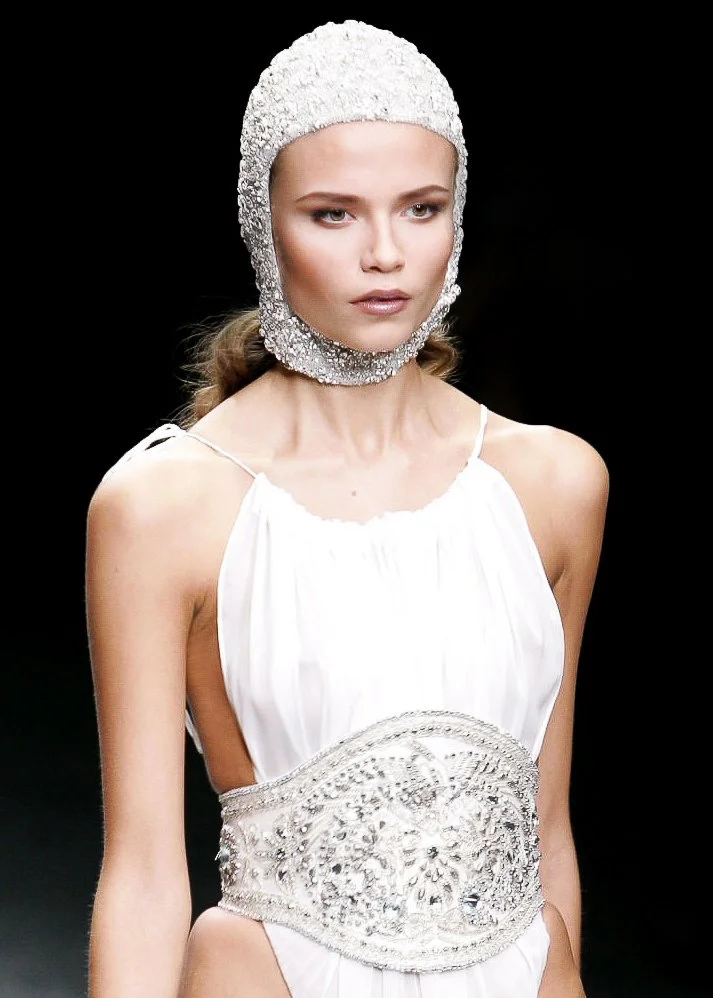 Natasha Poly modeling a bodysuit and cuirass - inspired belt at the Alexander McQueen Spring / Summer 2006 presentation • October 7, 2005 • Imprimerie Nationale • Paris • Robert Fairer • Image courtesy of Alexander McQueen : Unseen by Robert Fairer