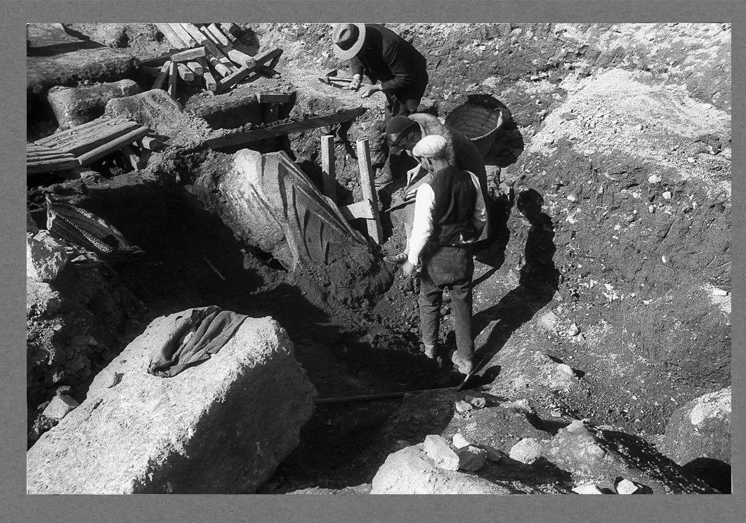 The statue of Hadrian lying face down in the Great Drain • 2nd A.D. • Roman • February 5, 1932 • Athenian Agora Excavations • Athens • Image courtesy of the American School of Classical Studies at Athens